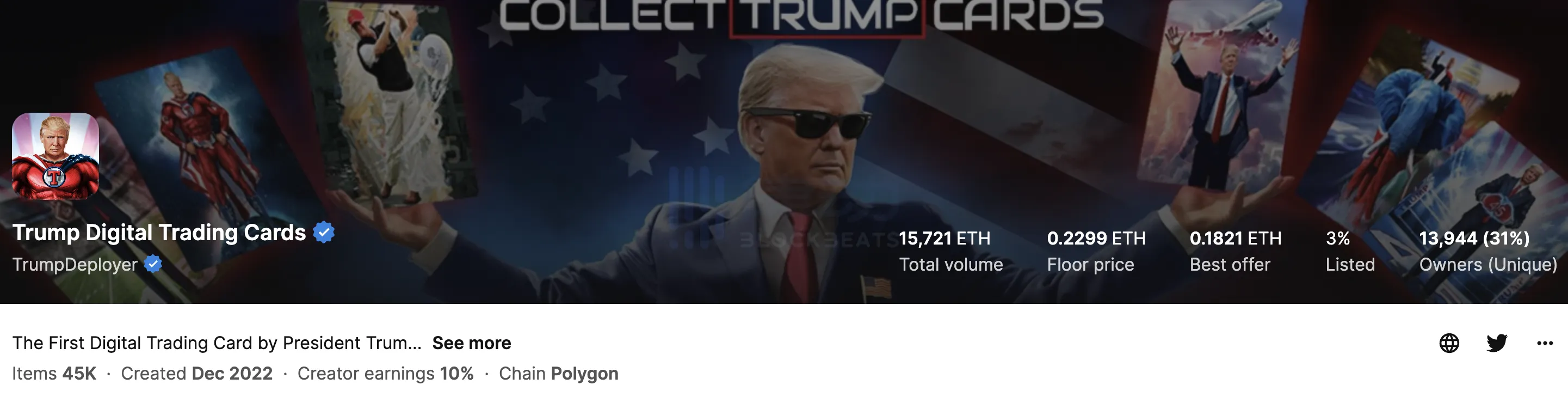 2022 年 12 月 16 日,特朗普在社交媒体上首次宣布推出其个人主题 NFT 收藏系列「Donald Trump Digital Trading Card」,总量 4.5 万枚,单张售价 99 美元。在推出后的两天内,Donald Trump Digital Trading Card 的地板价曾一度突破 0.6 ETH。按照当时 ETH 兑美元的汇率计算,其地板价一度高达 700 美元。
