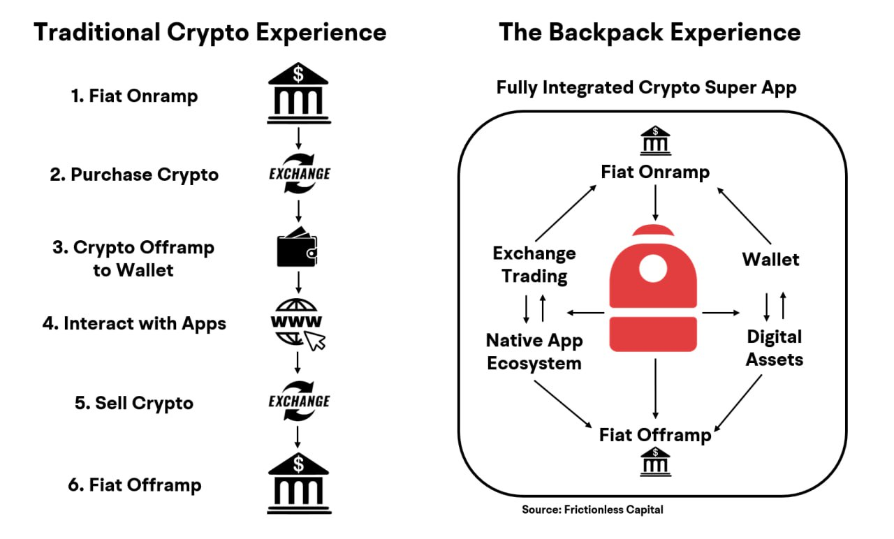 当然,Backpack 通过「xNFT」所整合的应用远远不止 NFT 相关,还有 DEX、跨链、DeFi 等等。以往的 Crypto 链上交互流程中,我们需要入金,然后在 CEX 买 Token,提到链上,再去一个又一个不同的网站连接钱包交互。而 Backpack 钱包将完全改变这个流程,只需入金买 Token,然后在 Backpack 集成的各种 Solana dApp 上直接使用就可以,如同我们给自己的 Apple 账户充值,然后在 iPhone 上的各种 App 进行内购。