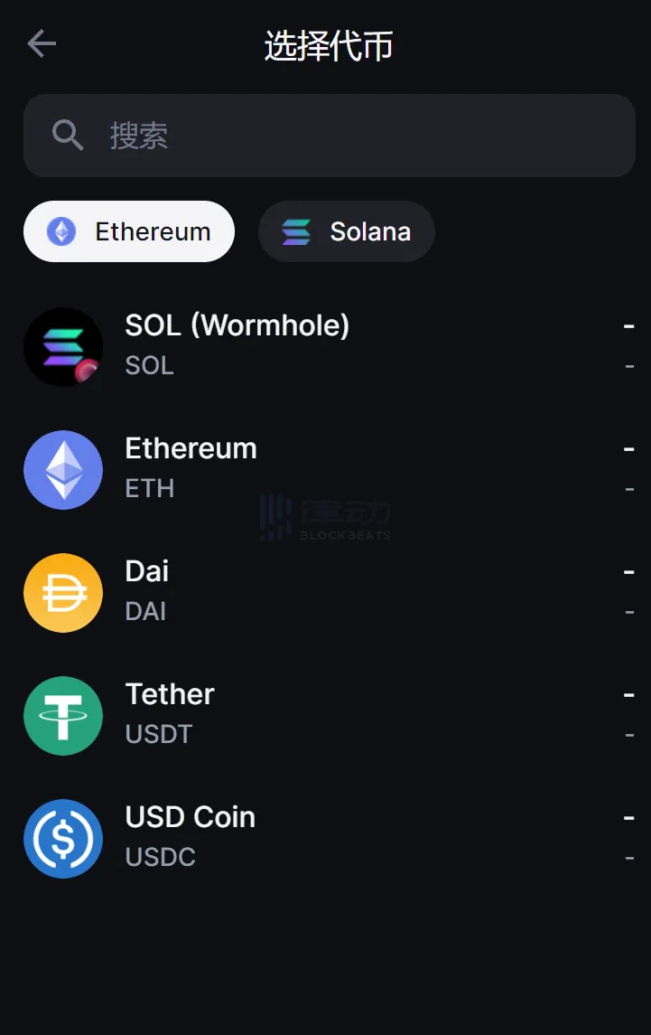 选择 SOL 进行 Swap 后,目标 Token 可以选择 ETH 链的 ETH,轻松完成 SOL 与 ETH 间的跨链与转换。