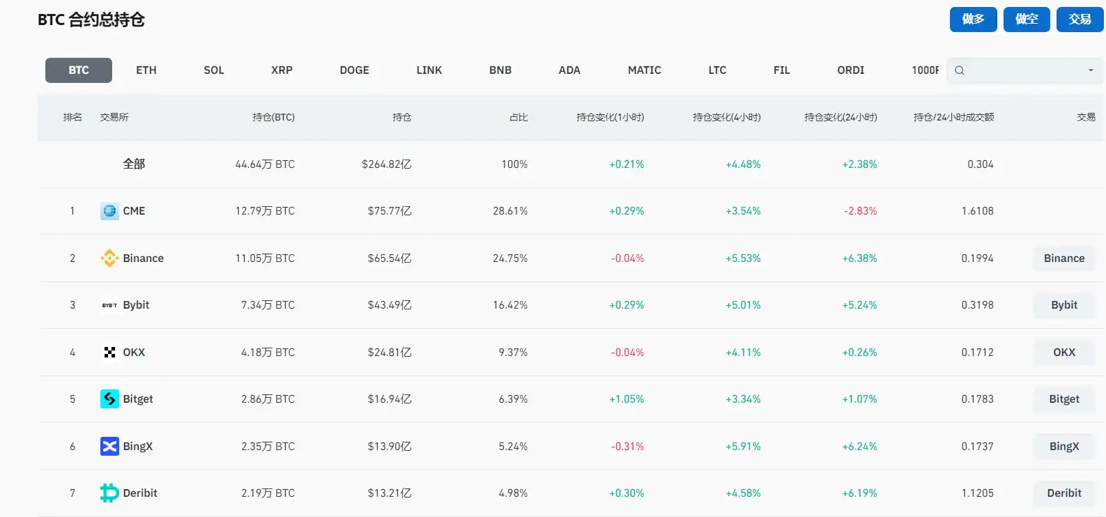 而 BTC 合约总持仓量排名中,CME 领先 Binance10.23 亿美元。