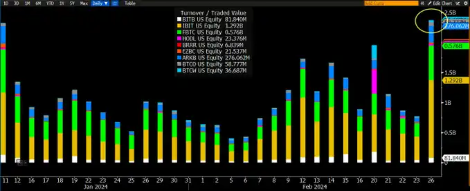 同时,据今日的新数据显示,9 支比特币现货 ETF 昨日总交易量约 24 亿美元,为上市首日以来的最高记录,略高于上市首日的交易量,约为近期日均交易量的两倍。