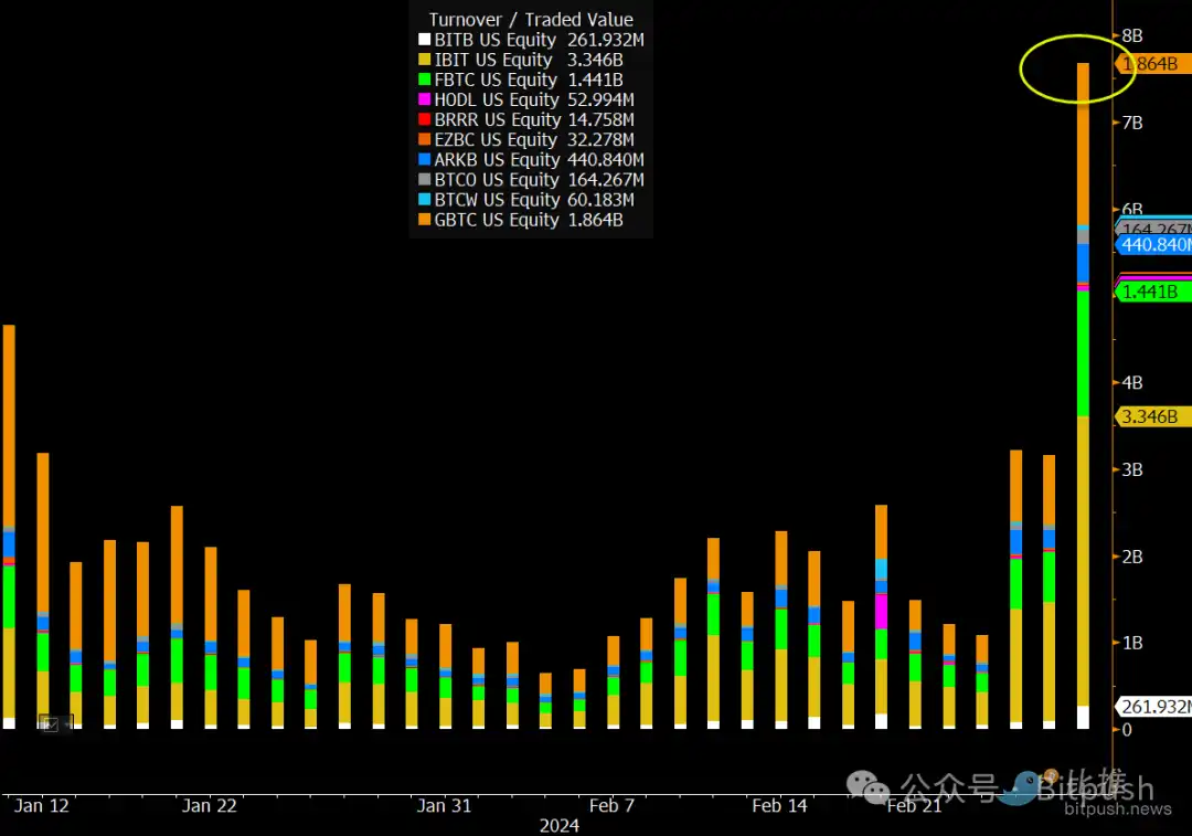 根据彭博社的数据,截至美股周三收盘,现货比特币 ETF 的成交量达到 76 亿美元,打破了 1 月 11 日首个交易日以来 47 亿美元的历史记录。