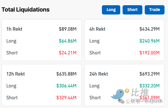 CoinGlass 数据显示,市场剧烈波动导致加密全网爆仓超过 6 亿美元。在过去 24 小时内,有 178,095 名交易者被平仓,总金额为 6.9329 亿美元。