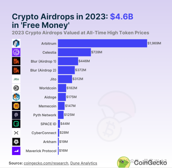尽管 2023 年是刺骨寒的熊市,很多项目方还是向用户分发了大规模的空投奖励。熊市中的 FreeMoney 让用户们趋之若鹜,仅以 Coingecko 的数据为例,以空投 Token 的 ATH(alltime 最高点)价格计算,仅过去一年中,Arbitrum 和 Celestia、Blur 等项目方就向用户分发了大约 46.5 亿美元的空投。