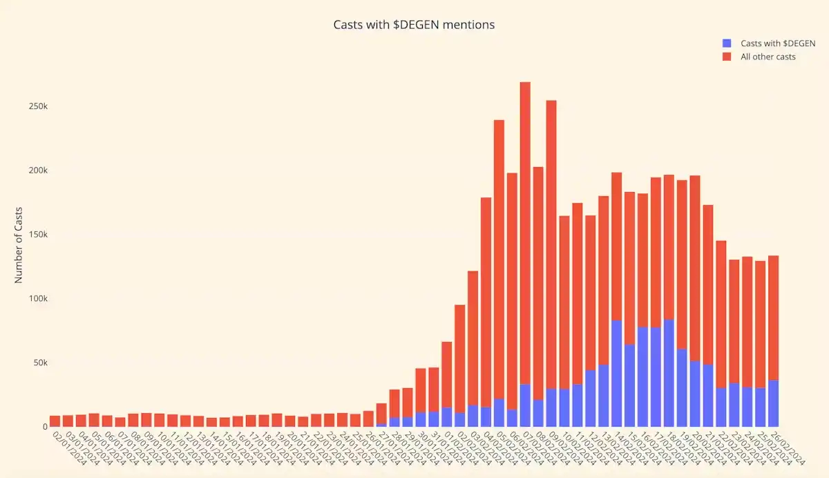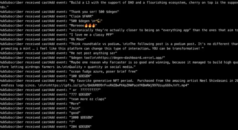 上周,我和一个朋友决定连接到 Farcaster Hub 的实时发布流。我们运行一会就意识到,我们屏幕的大部分都被$DEGEN 填满了。