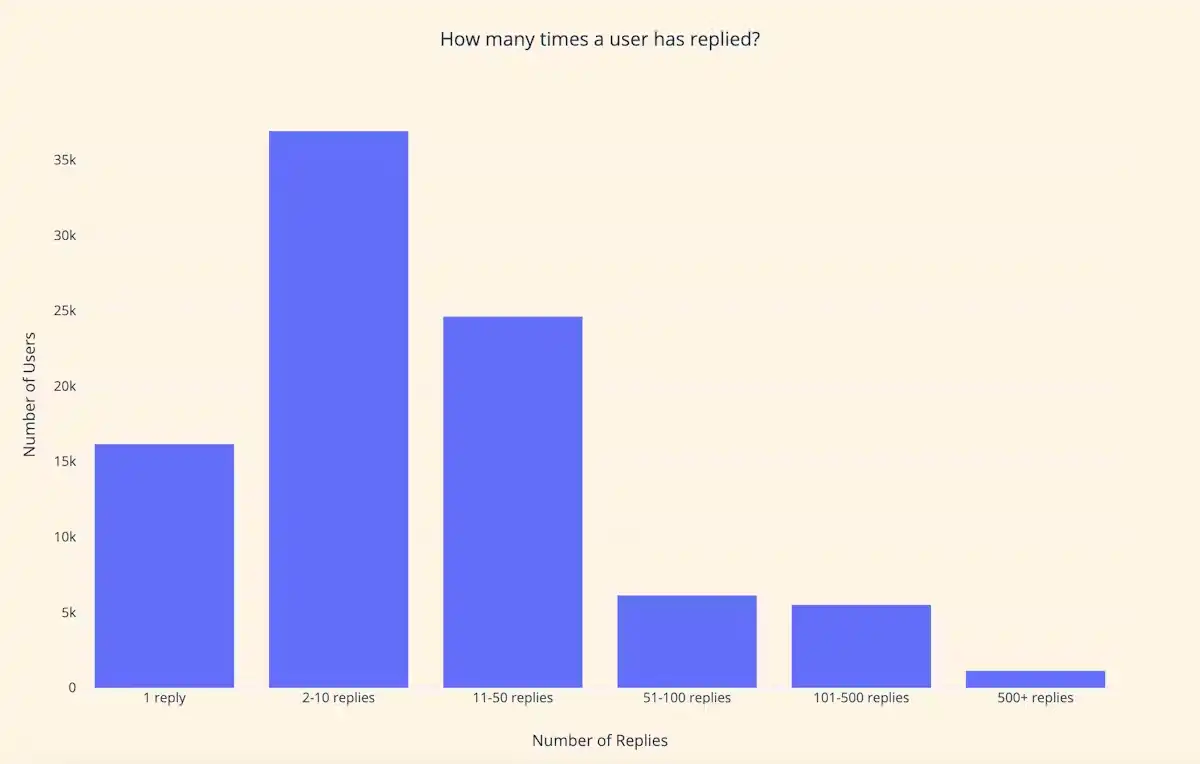 秉承 replyguys 的精神,Farcaster 上高达 64% 的发布都是回复。根据用户的回复次数进行分组时,大多数用户似乎都属于多次回复用户(如下图所示),一些极端回复用户的回复次数高达数千次(仅在几周的活动之后)。
