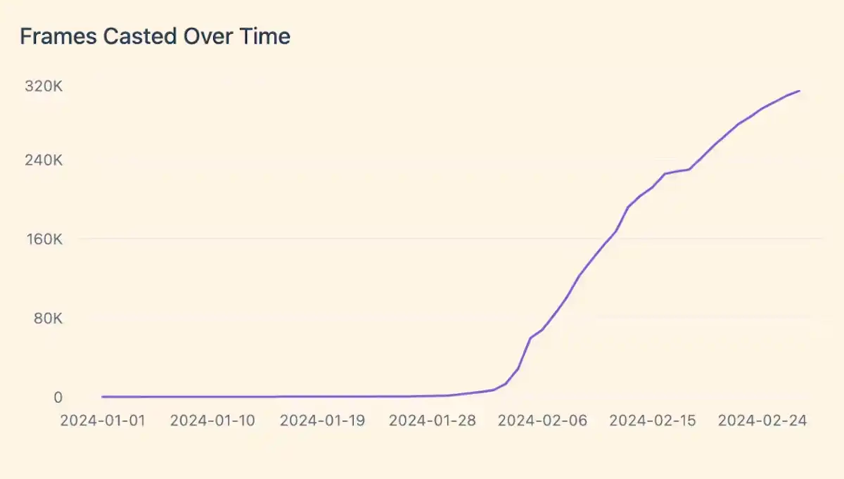 最后,让我们来谈谈房间里的大猩猩。Frames 的推出和 NFT 铸造、应用、游戏等的 frame-ification 为用户和开发者在 Feed 上解锁了大量创意和有趣的体验。不仅今年带有 Frames 的发布数量激增(见下文),而且 2024 年,Frame 的发布获得的点赞数占 Farcaster 上点赞总数的近 22%。