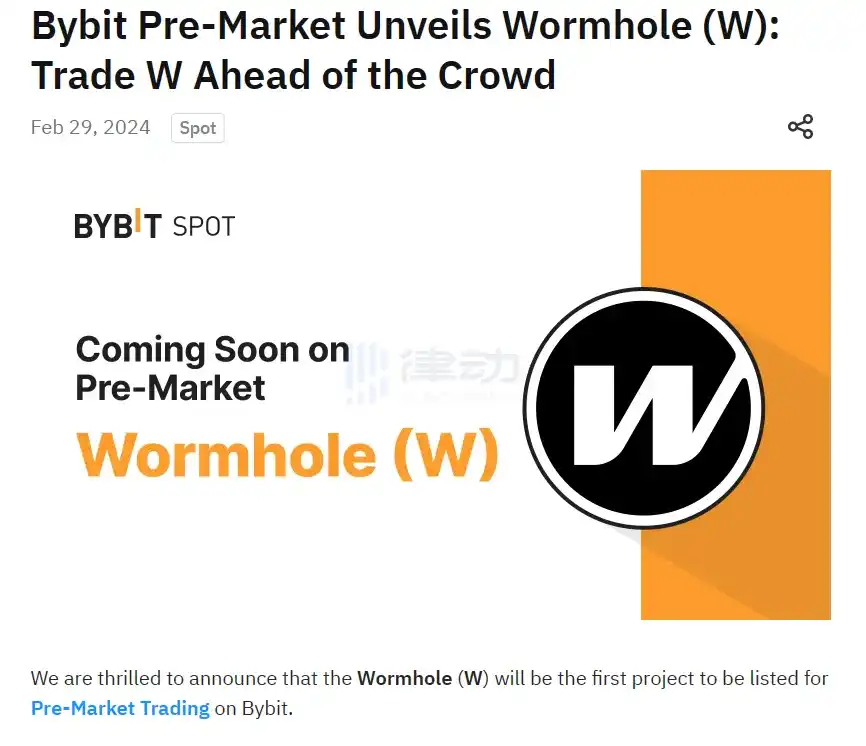据官方公告,Bybit 盘前交易上线 Wormhole(W),W 的盘前交易将于 2024 年 3 月 1 日 UTC 时间上午 10:30 开始。