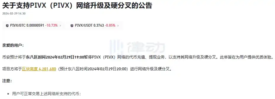 Binance 将支持 PIVX(PIVX)网络升级及硬分叉