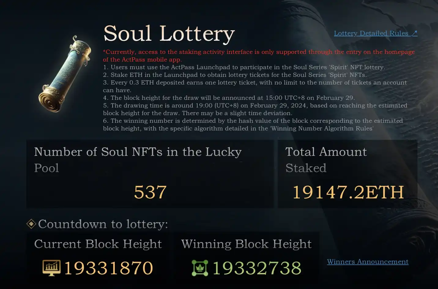 自 ARPG 暗黑刷宝类链游《SERAPH: In the Darkness》开启 Soul「英灵」系列头像 NFT 的公售质押以来,社区热情持续增加。短短 2 天内,仅有的 537 份公售的彩票池已经吸引了共计 19,147.2 枚 ETH 的投入,价值超 6670 万美元,显示出社区对于 Soul「英灵」系列头像 NFT 的极高期待和支持。