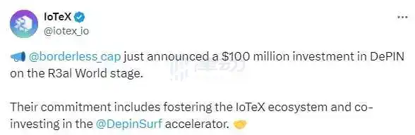 DePIN 区块链平台 IoTeX 在其社交平台平台表示,Web3 风险投资公司 Borderless 刚刚在 R3al World 活动上宣布向 DePIN(去中心化物理基础设施网络)项目投资 1 亿美元,其中包括促进 IoTeX 生态系统和共同投资加速器 DePIN Surf Accelerator。