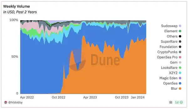 第一次空投后,Blur 确实经历了每周交易量的下降,认为这是整个 NFT 市场的低迷,该市场于 2023 年 10 月触底。此后,Blur 的市场份额不仅恢复了,而且还增长了。该平台目前约占每周交易量的 77%,即使在去年 11 月 Blur 推出第二次空投之后,这一数字仍在继续增长。