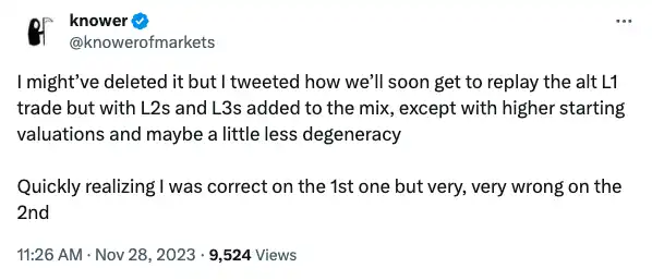 每个周期我们都会获得新的区块空间,未充分利用的 L1 和 L2 会发生一些价值侵蚀,也许时不时地,看起来很像 L1 叙述(数据可用性、再质押等)的新价值捕获将自身插入到一个稍小的飞轮,然后是一波模仿者和这些协议的第 n 个版本,沿着「不可思议的十亿美元 FDV 代币的安乐死过山车」下降。
