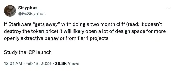 黑马和最有可能的候选人是社区,更广泛的生态系统可能会迫使变革。我们最近看到了这一点,Starkware 团队受到了有效的欺凌,改变了他们的团队和投资者的解锁时间表。