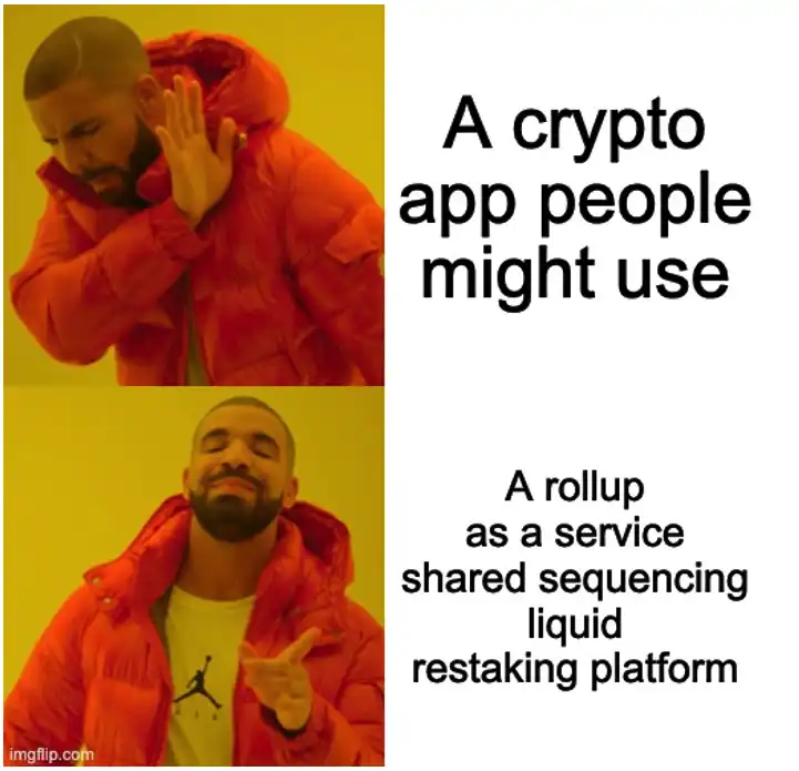 这引导我们得出一个合乎逻辑的结论:如今,大多数开发者认为最极致的 EV(预期价值)之举是构建新的 L1 或 L2,而不是 Dapps 或以应用为中心的协议,这导致了世界进一步的碎片化以及大量无用的区块空间。随后,他们采取降级措施,构建抽象层,以吸取 L1/L2 中的一些价值,比如在 LST 等方面。