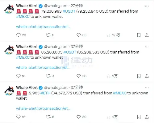 3 月 4 日,据 Whale Alert 监测,价值近 2 亿美元资产从 MEXC 转出至未知钱包。