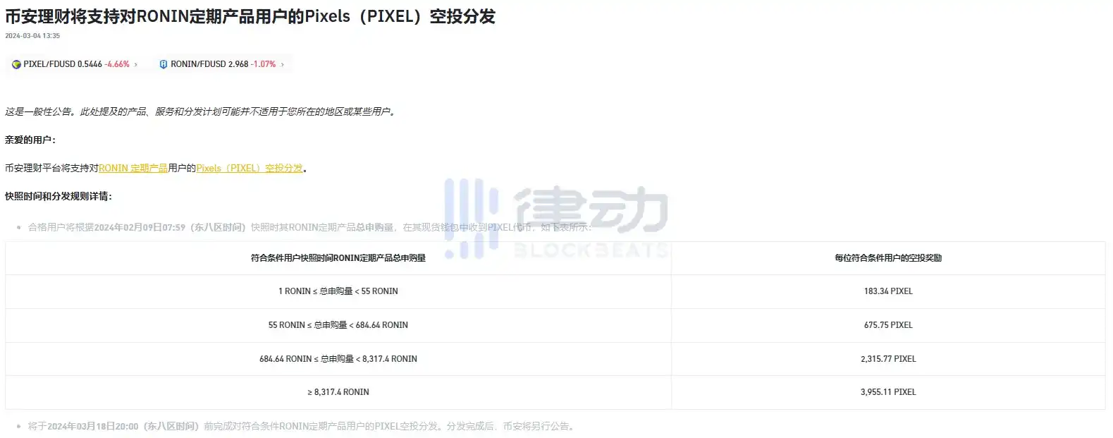 3 月 4 日,据官方公告,Binance 理财平台将支持对 RONIN 定期产品用户的 Pixels(PIXEL)空投分发。Binance 将于 2024 年 03 月 18 日 20:00(东八区时间)前完成对符合条件 RONIN 定期产品用户的 PIXEL 空投分发。