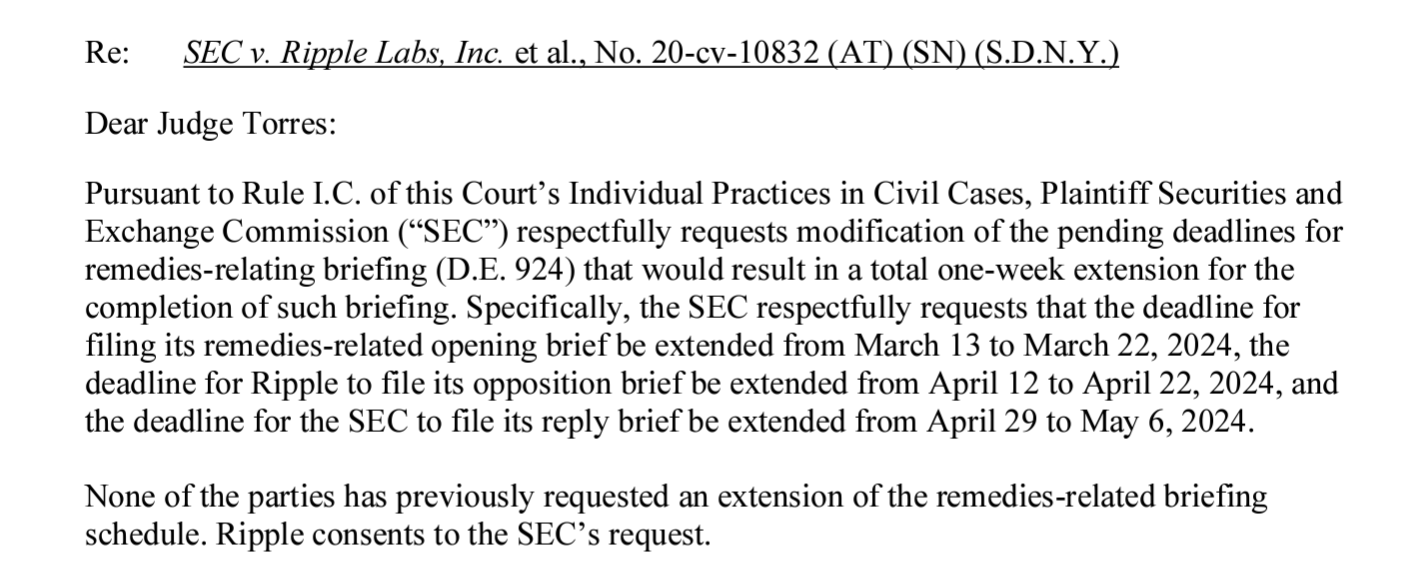 3月1日提交的法庭文件允许美国证券交易委员会延长提交瑞波公司提交的与补救措施相关的证据材料。该延期允许监管机构在 3 月 22 日之前提交其开庭辩护状。瑞波公司提交反对意见简报的截止日期也被延长至 4 月 22 日,美国证券交易委员会提交答辩的新截止日期为 2024 年 5 月 6 日。