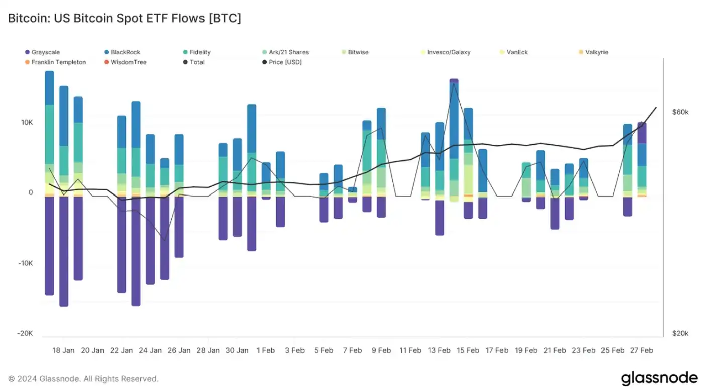 比特币在 2 月上涨了 45%,自现货比特币 ETF 推出以来,我们已经看到超过 67 亿美元的净资金流入新的 ETF 产品,目前的比特币价格也比历史高点相距不到 10%,但却感觉市场出奇地安静。