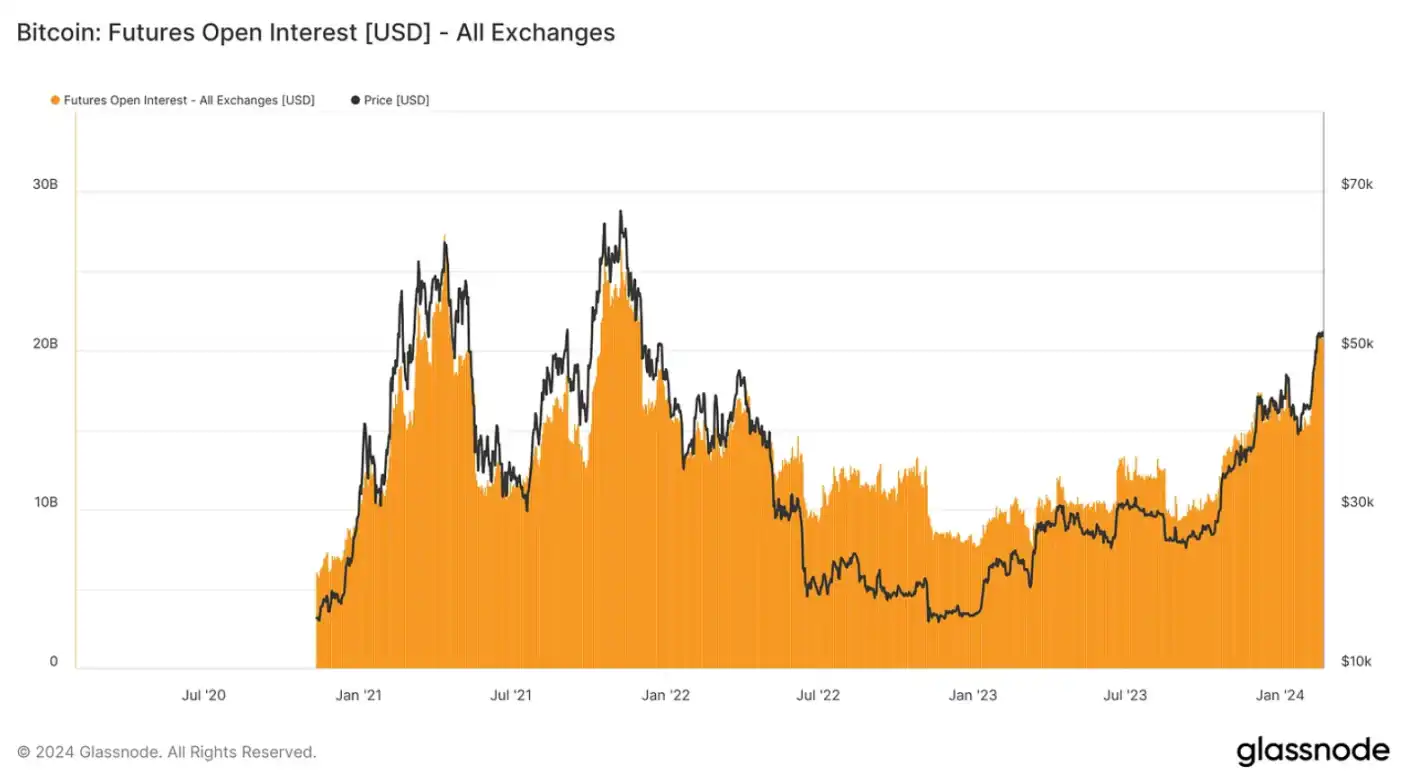 各家交易所的比特币未平仓合约也开始接近此前牛市周期的峰值水平——这是短期内值得关注的重要数据。