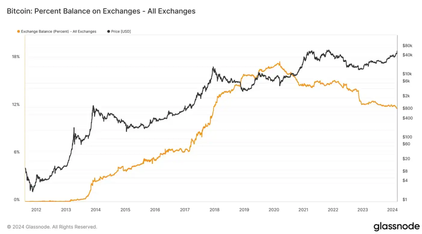 比特币似乎正变得越来越「缺乏流动性」,因为交易所内的可用数量目前仅占流通供应量的 11.7%,这是自 2017 年底以来的最低水平。