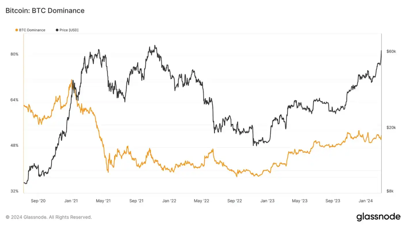 那我们今天看到了什么?比特币的主导地位正在上升,再次带领市场走出熊市,目前占加密货币总市值 51% 的市场份额。这也再次印证了市场处于牛市早期阶段,作为参考,在上一个周期中,比特币在「山寨币 Summer」开始之前达到了 70% 的主导地位。市场肯定不会完全复刻该数据,但预计随着比特币接近历史高点,其主导地位将继续得到增强。