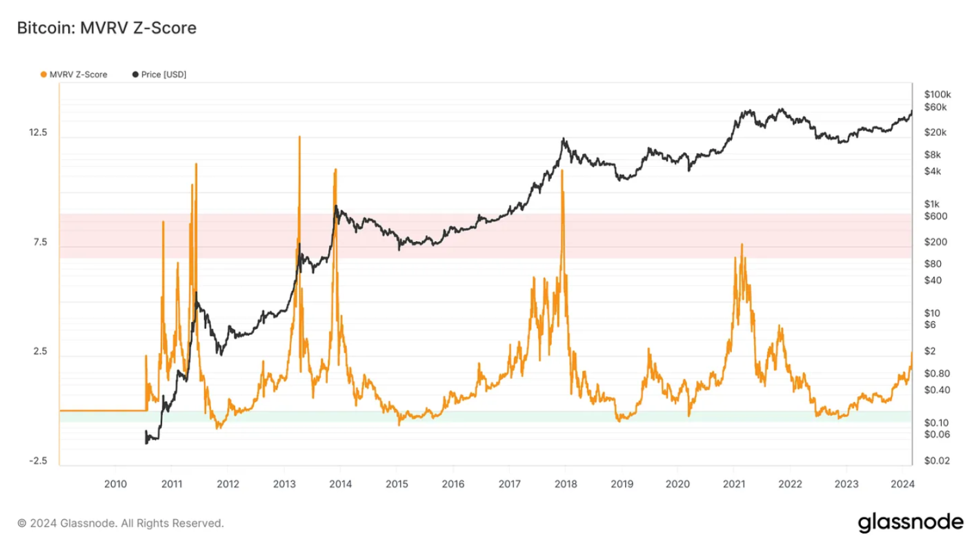 当下是什么情况?MVRV 刚刚达到 2,这与过去几个牛熊周期的早期阶段一致,表明牛市周期刚刚开始,此前在 2021 年,我们曾在牛市巅峰达到 7.6 的最高值。