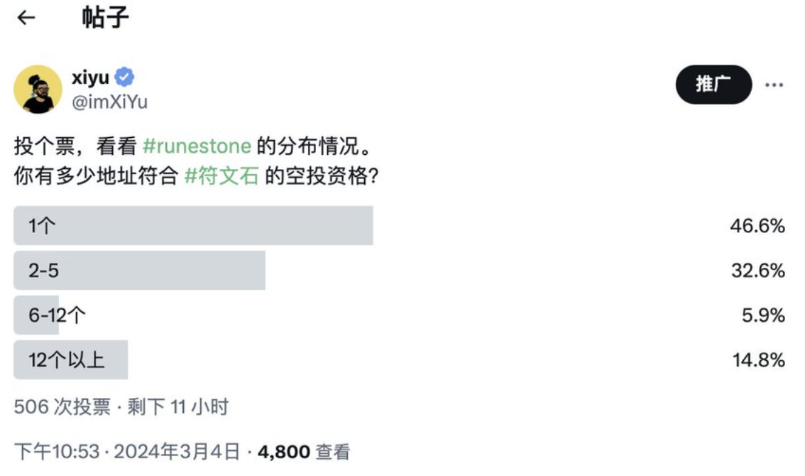 昨天在推特上的投票,收到了 500 票,大约一半的人只有 1 个符文石,其次是 2-5 个的,2-5 可能是因为不同钱包软件轮流使用,所以才符合空投资格。