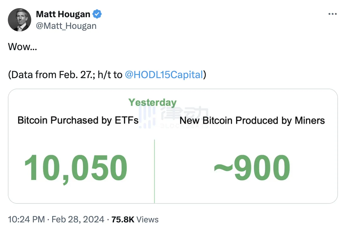随着价格持续攀升,许多人都在寻找原因,最明确的答案是供需失衡。比特币现货 ETF 带来的强劲需求超越了矿工挖矿产出的比特币。