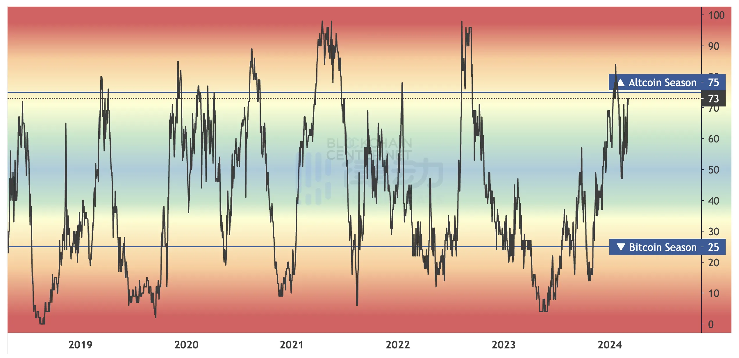 如果前 50 名代币中 75% 在 90 天的表现优于比特币,则为山寨币季节。据 BlockchainCenter 数据,目前的山寨币指数为 73,山寨季还未来临,但距离 75 的标准已经较为接近。