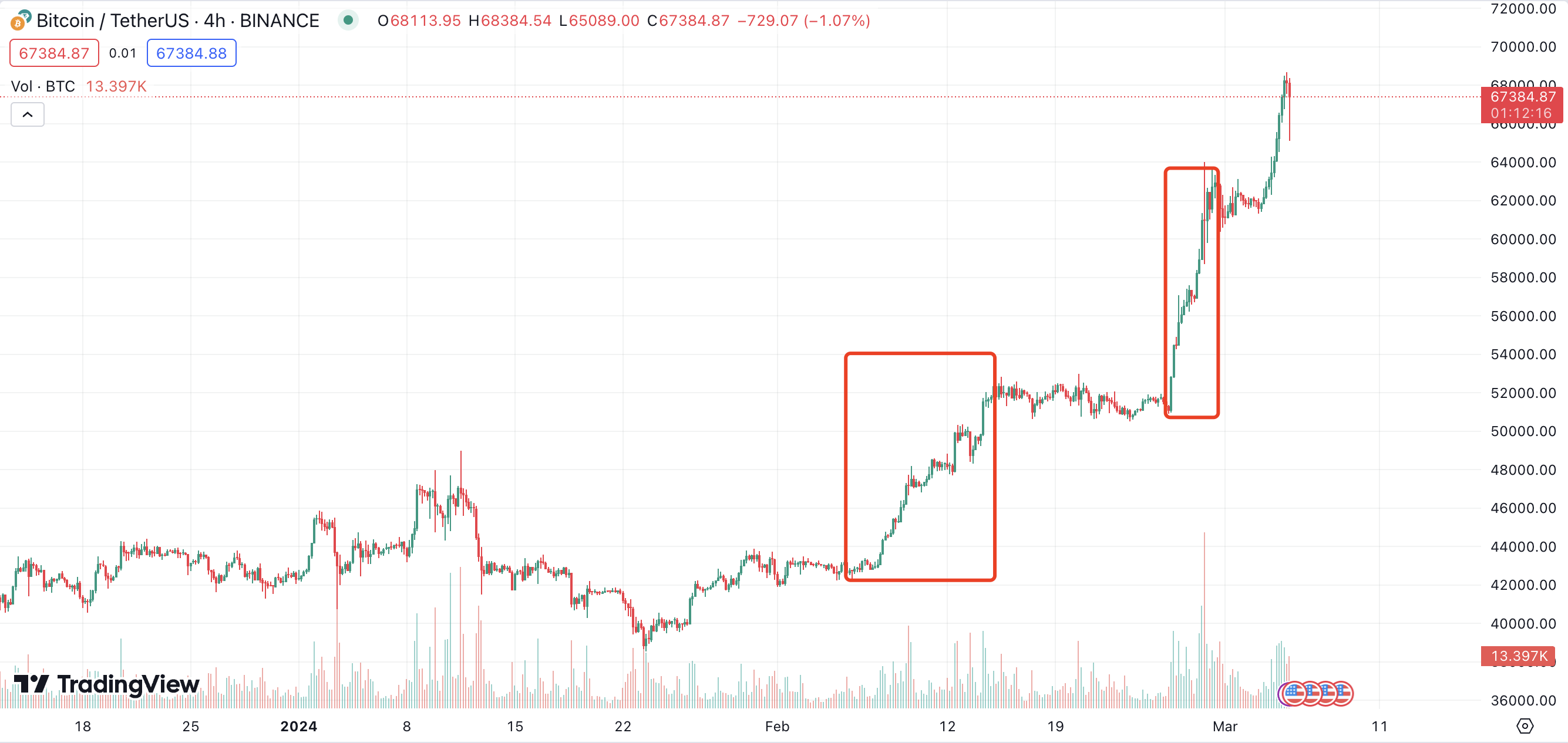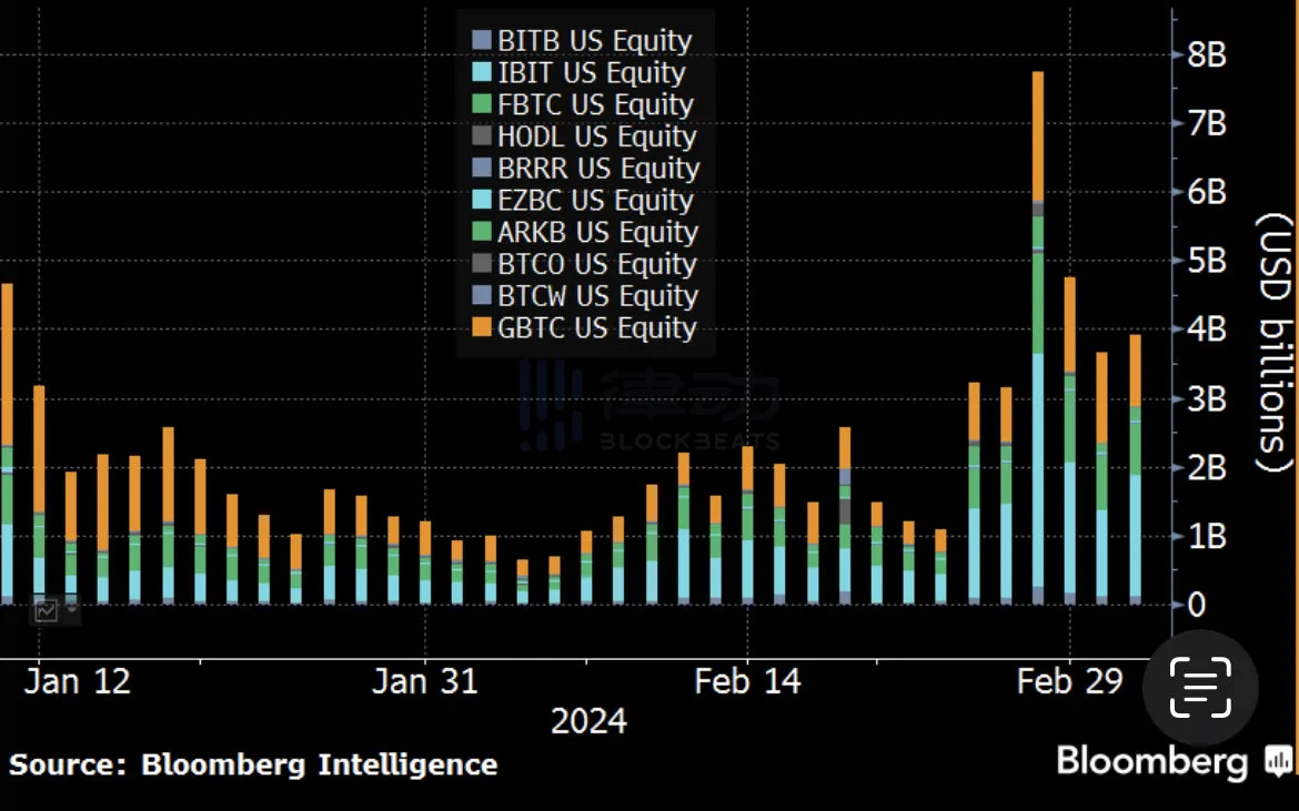 2 月 29 日比特币现货 ETF 单日交易量达 76.9 亿美元,创下发布以来的新历史记录,随后几天总体也都保持在 40 亿-50 亿的水平。比特币现货 ETF 的成交量不到两周内强势流入,使得比特币价格逼近历史新高。