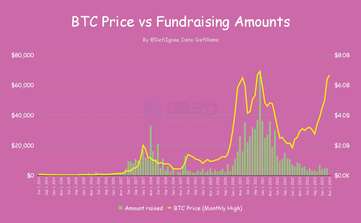 在之前的周期中,加密领域的融资数量都是紧随比特币价格的,但这一次并没有呈现相关趋势。据加密研究员Ignas分析,项目通常会在熊市期间筹集资金,然后选择在对他们来说更有意义时公布投资。但目前市场如此火热,「公布金额」仍然相对较低。这说明未来将会有更好的时机宣布融资新闻,因而更看好后市。