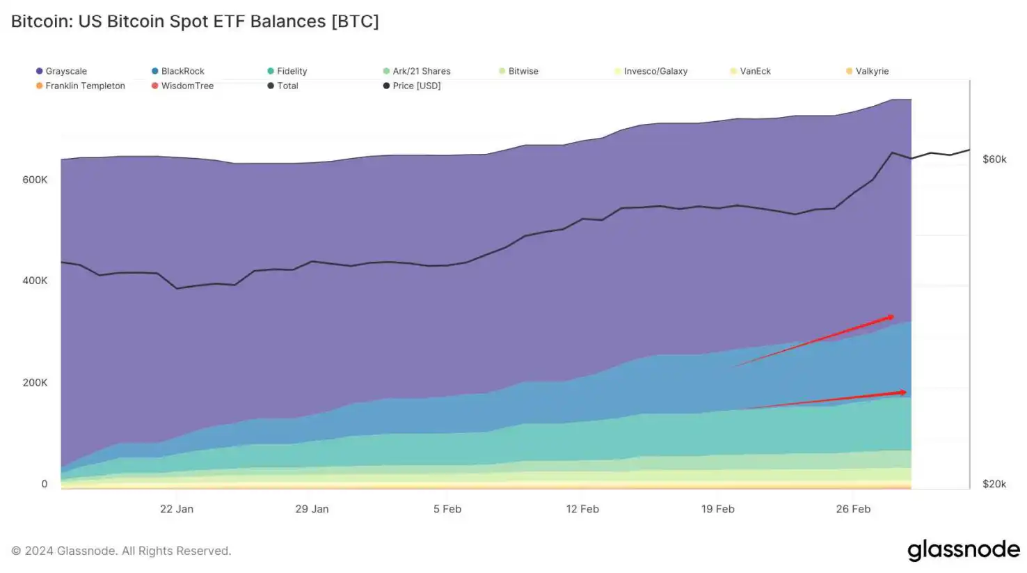 5. 据三位为基金管理公司工作的分析师称,⾃2⽉初以来,BTC ETF 产品平均每天购买 3500-4300 枚 BTC,远超过了每天产生的 900 枚 BTC。
