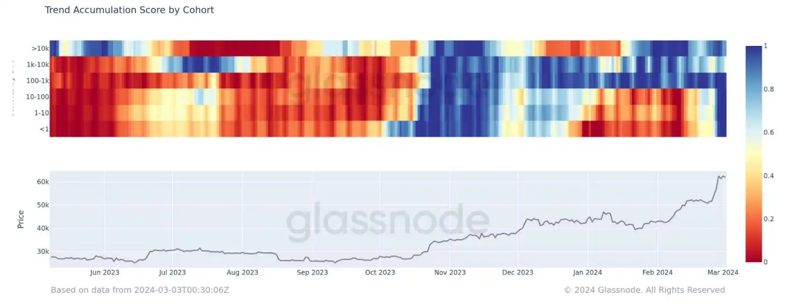 「1k-10k」和「>10k」的大体量积累分数有略微减少的情况,这可能意味着场内进入了中段。同时,中小体量群体的增多可能代表着场内陷入到⼀种多数群体狂热的阶段。