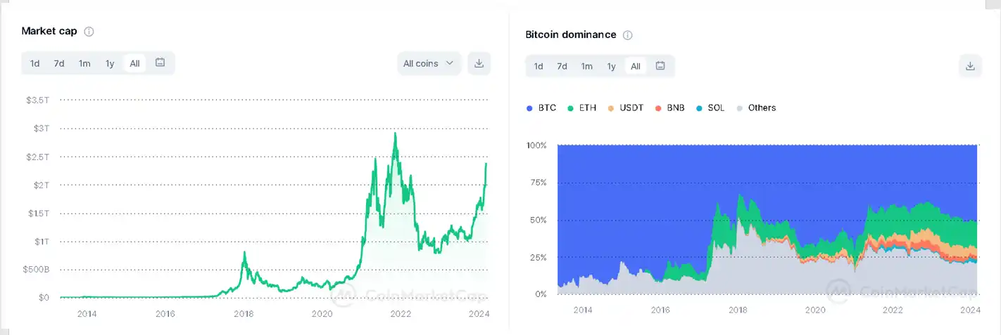 据 coinmarket 数据,目前加密货币总市值达 2.38 兆,24 小时涨幅 2.79%。其中,比特币价格 66,557 美元,24 小时涨幅 1.46%,市值达 1.3 兆,市占率超过整个加密总市值一半,达 51.17%。