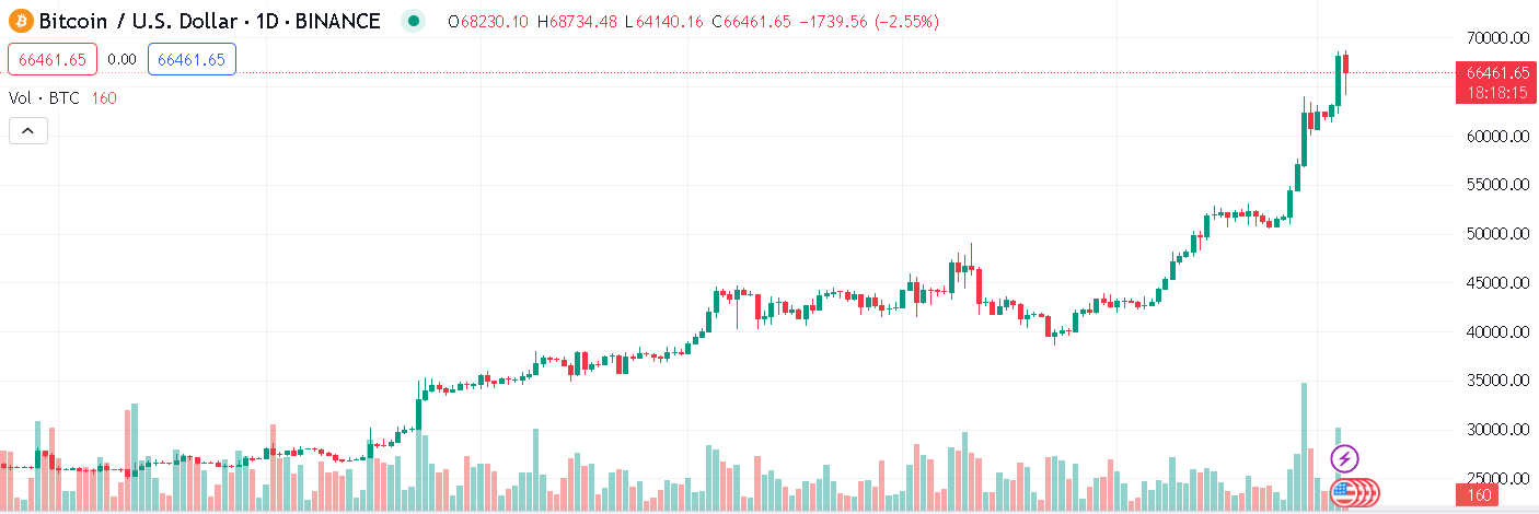 近日,比特币的涨势可谓引爆了加密社区的 FOMO 点,其价格在时隔 829 天再次突破 6 万美元后仍无回调迹象,持续上涨至 68,000 美元。据 TradingView 数据,截至撰稿时,比特币价格仍维持在 66,000 美元上方。