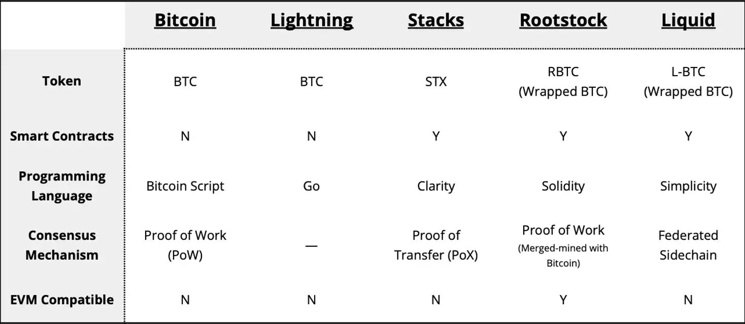 比特币二层由「四大金刚」所引领:即 Stacks、闪电网络(Lightning)、RSK 和 Liquid。这四个主体承担执行了大多数比特币 L2 交易,塑造了比特币可扩展解决方案的格局。每一个 L2 解决方案都有其独特的特点和功能,为比特币生态系统的增长和可扩展性做出了独特的贡献。
