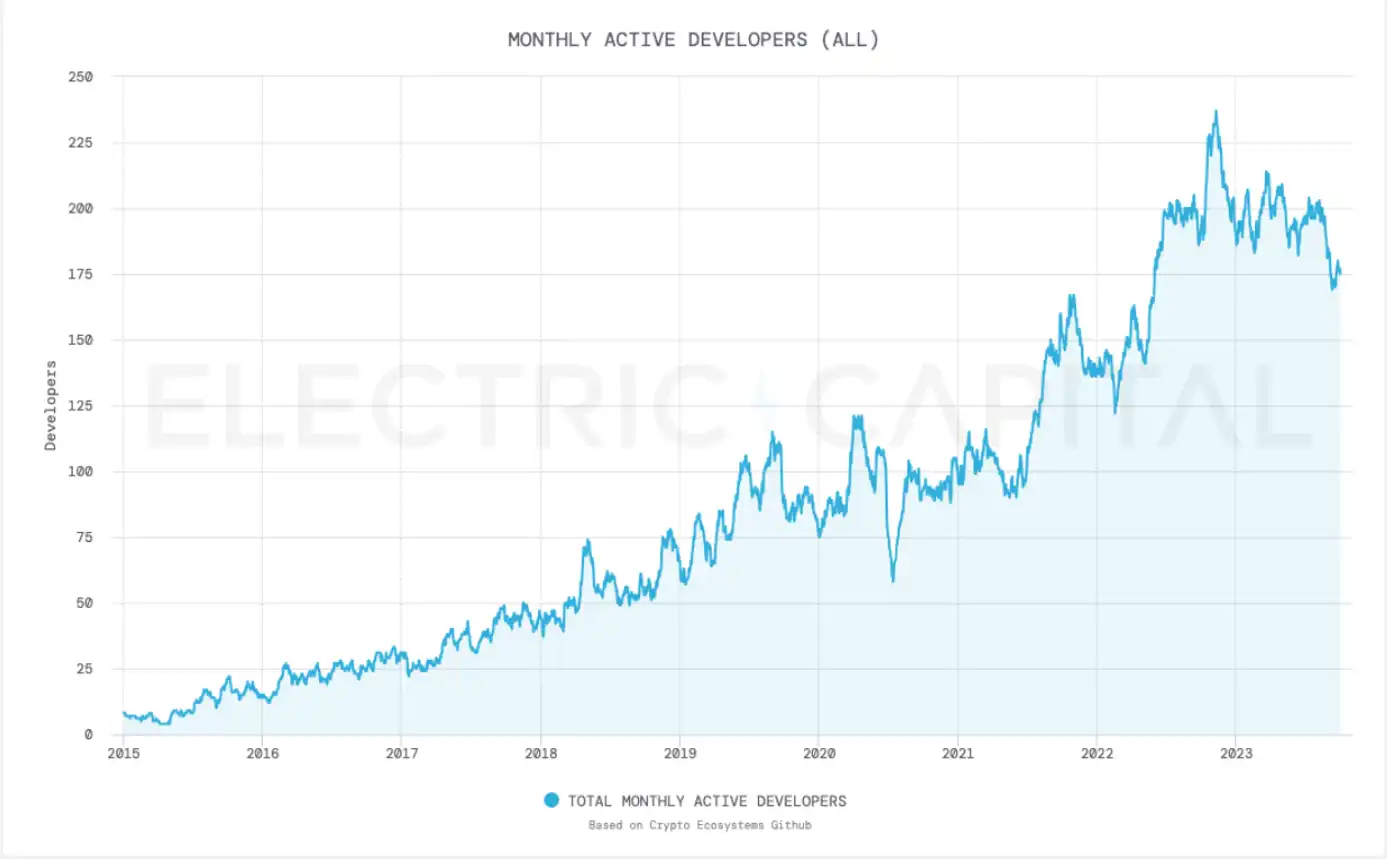 在 Stacks 上的每月活跃开发者数量。来源:Electric Capital