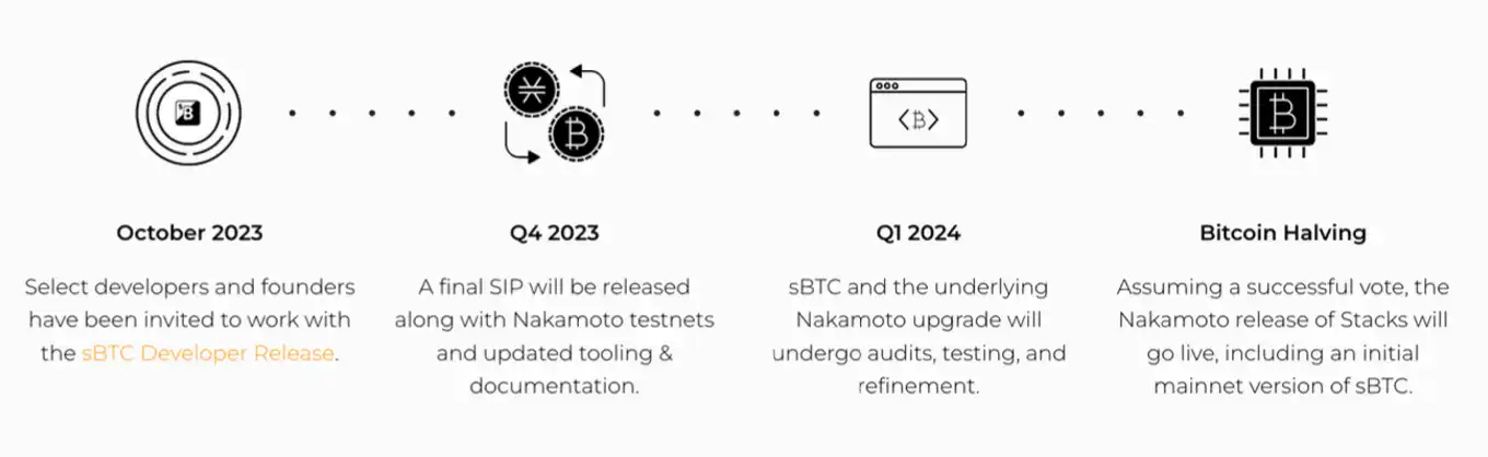 ○ Nakamoto 网络升级(2024 年第二季度)将使 Stacks 通过 L2 实现快速且价格低廉的 BTC 转账,同时还 100% 拥有与比特币网络一致的安全性(重组抵抗力)。此外,网络的交易速度将从当前的单次结算时间 10 至 30 分钟以上,减少至大约 5 秒钟一个区块,速度提升了约 1000 倍,远优于比特币两个区块产出之间所需的时间。截至 2023 年 12 月,该升级开发已达成了两个主要里程碑,即 v0.1 版本的「Mockamoto」和 v0.2 版本的Neon,这是一个「受控」的测试网,具有单一矿工、单一堆栈者和堆栈者签名功能。