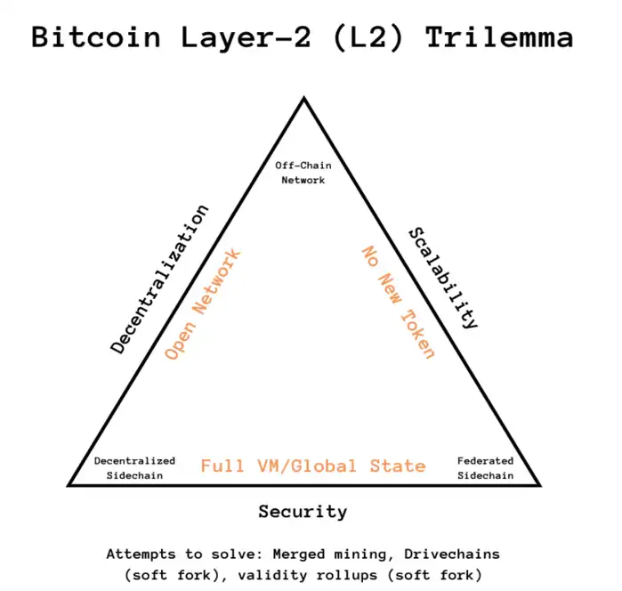 在探索提升比特币生态层扩容性的过程中,一个新问题浮现出来:即 L2 的不可能三角。回顾区块链的不可能三角并将其应用于比特币的 L2 时,这些问题依旧存在,只是权衡的抉择略有不同。在 L2 不可能三角中,选择被限制于: