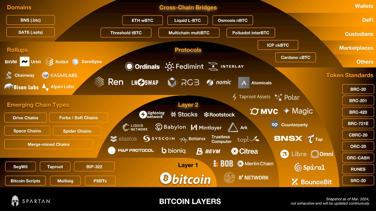 这些发展不仅仅是技术上的飞跃,还彰显了比特币实用性的范式转变,为用户采纳和应用部署开辟了新的路途。分层架构方式凸显了比特币拥有适应性和不断进化的能力,因此,比特币仍然在日新月异的数字世界中进一步巩固了其地位。以下部分详细描述了这些类别中的关键创新点,展示了比特币分层生态系统的动态性和前瞻性。