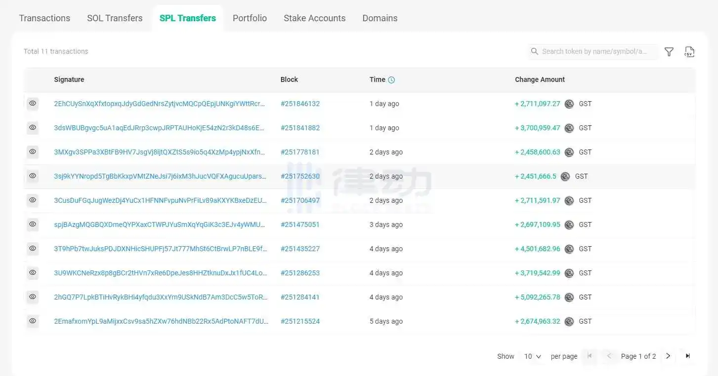 据 Solscan 数据,某鲸鱼于过去一周持续从 Coinbase 提取 GST,现该地址已持有价值 321 万美元 GST(Solana 链上),持有量排名第 11。