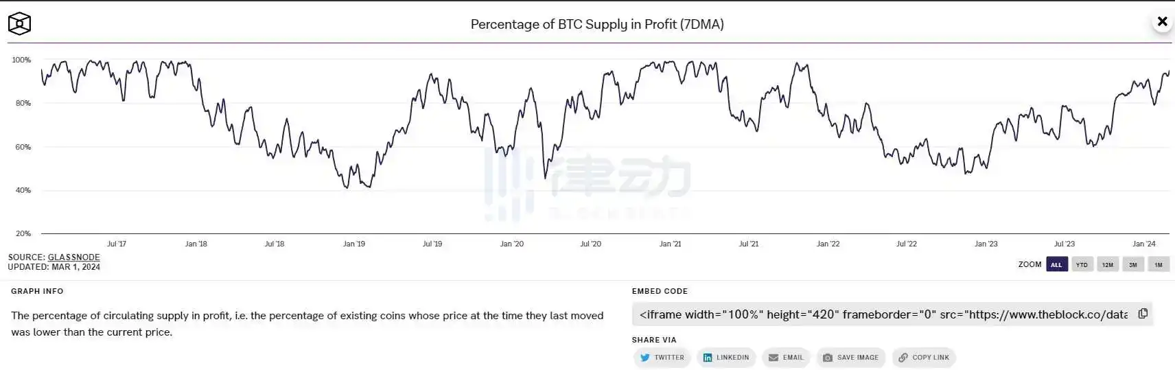 比特币流通供应盈利占比达 94.93%,创 2021 年 11 月以来新高