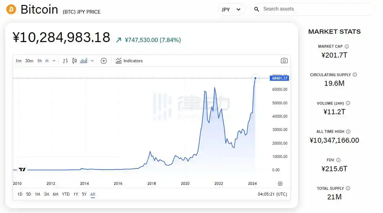 据行情信息,比特币兑日元汇率报 1: 10,267,442.84 日元,已创历史新高。