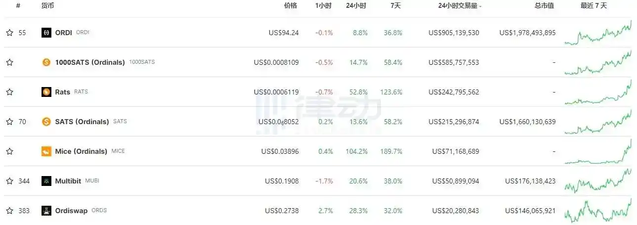 BRC-20 系代币普涨,RATS 24 小时涨幅超 56%