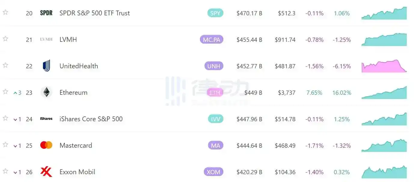据 8marketcap 数据,以太坊市值达 4490 亿美元,超越万事达和埃克森美孚等公司,资产市值排名第 23 位。