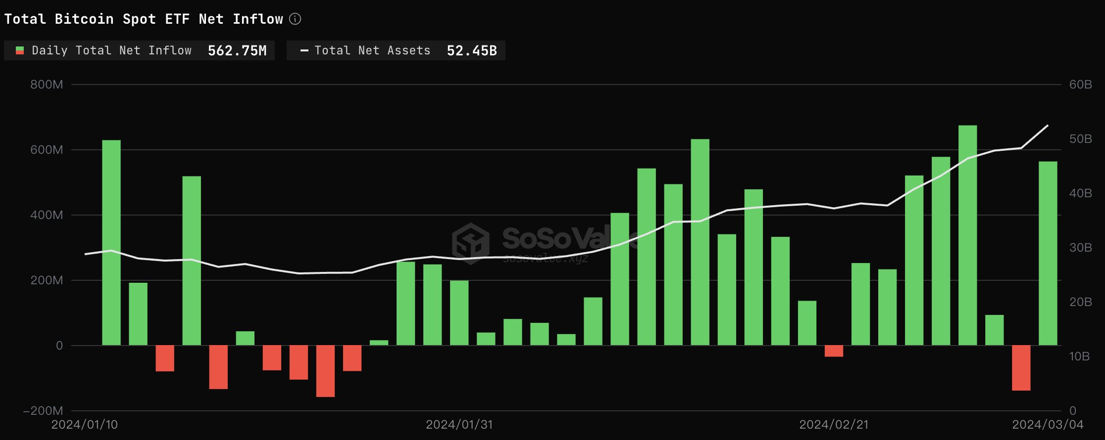 3月4日,随着比特币价格突破68,000美元,美国现货比特币交易所交易基金(ETF)净流入5.62亿美元,比特币价格日益逼近约6.9万美元的历史高点。这是现货比特币 ETF 自 1 月 11 日开始交易以来第三大资金流入日。