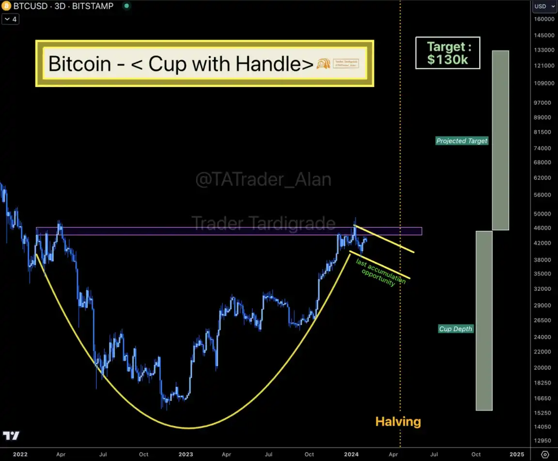 知名交易员 Alan Tardigrade 在推特发布图表(今年 2 月),表示出现所谓柄图,该模型预测 BTC 将达到 13 万美元。