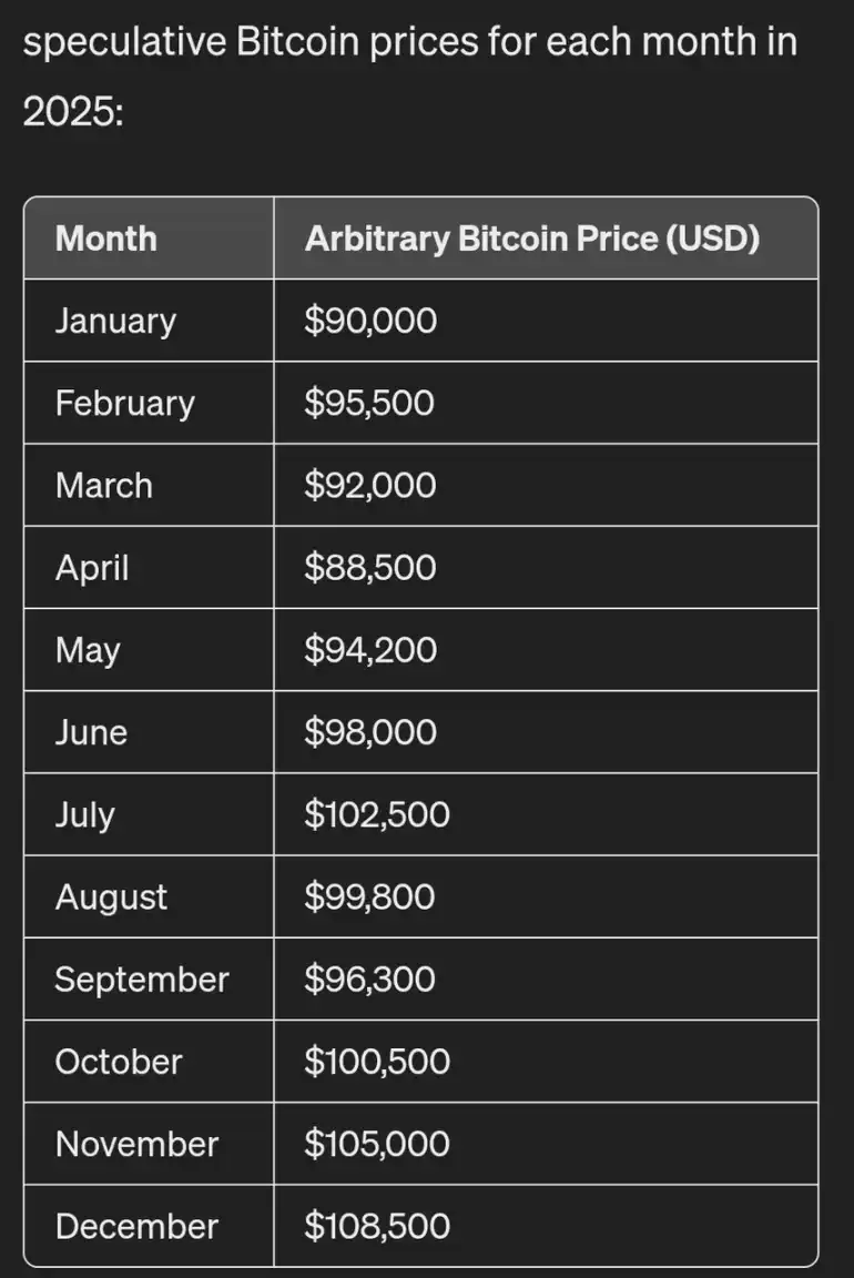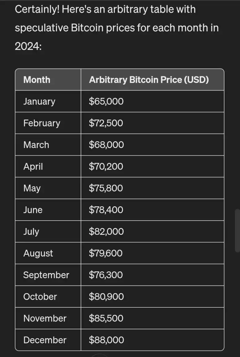 根据推特一位网友试验,在数据输入 ChatGPT 之后,列出如下数据图。ChatGPT 预测 BTC 可能在今年达到 8.8 万美元,并在明年末超过 10 万美元。