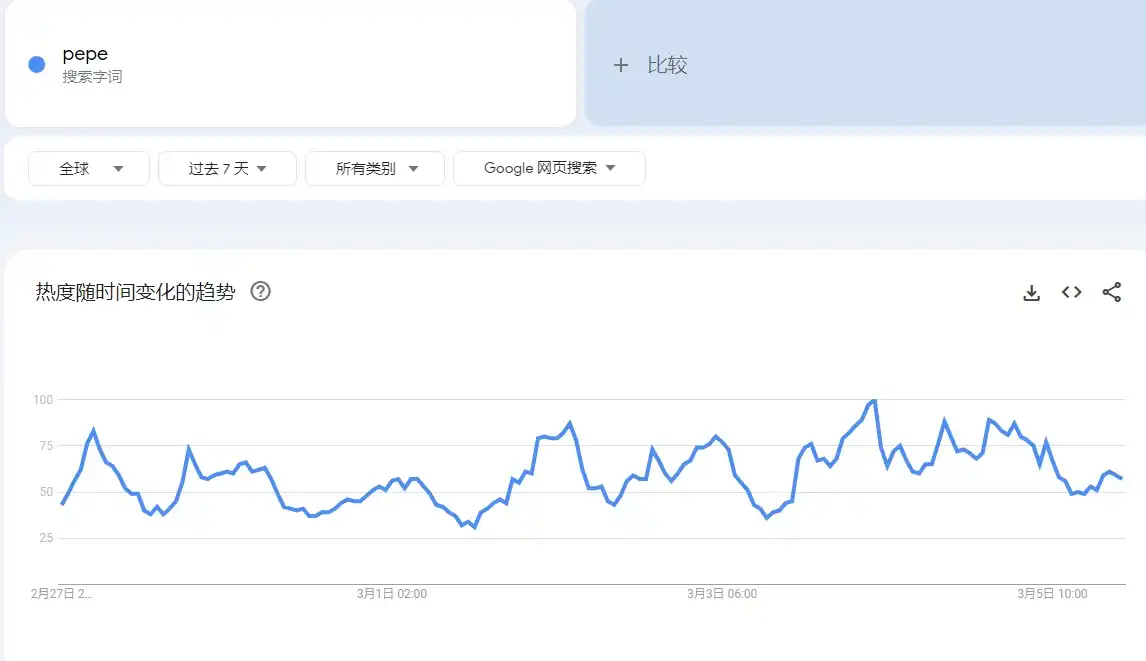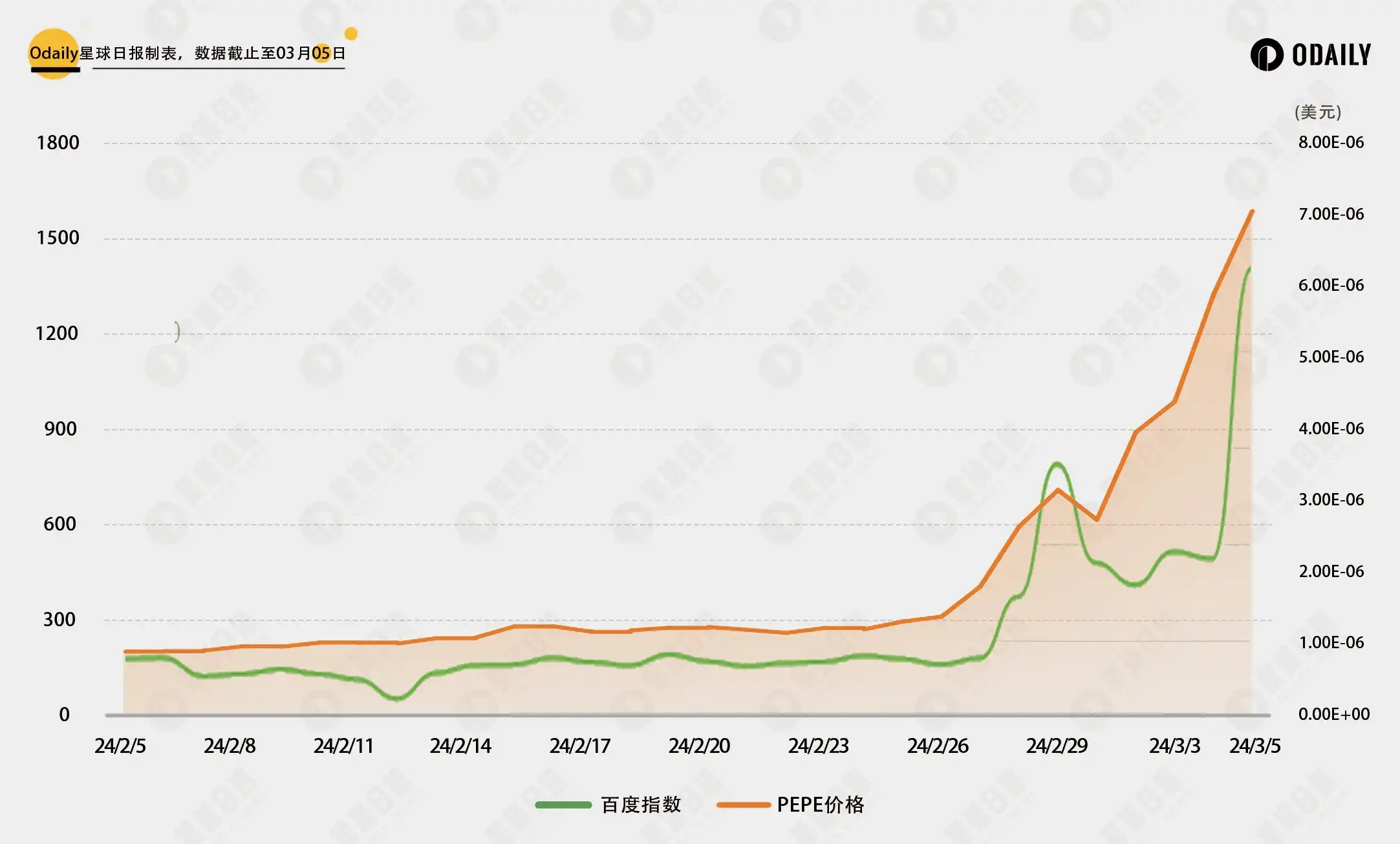 PEPE 近一个月的价格与社媒搜索数据如下,其中谷歌趋势由于官方设置原因,不能跨月查询,但经 7 日查询得到,热度与 2 月末没有显著变化。但在国内已经开始出现大幅偏离均值的波动,但偏离程度不及 DOGE 和 SHIB 曾创下的超百倍波动。